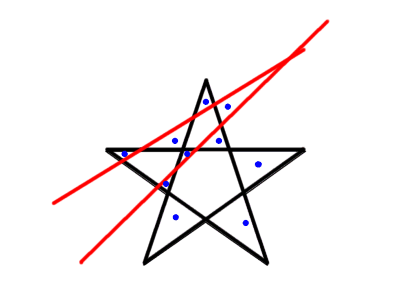 書いてあるとおり、右の星に2本の線を引いて、三角形を10個にしてください。 でも、ちょっとでもへんな形(三角ではない形)は数えませんよ。 内部に線の入った三角形は数えません。