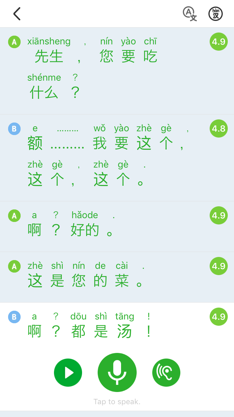 こちらはHello Chineseというアプリ。中国語の喋れるワタシヾ(*´∀`*)ノ気分になれるアプリです。実はピンインを読んでいるだけなのですが。