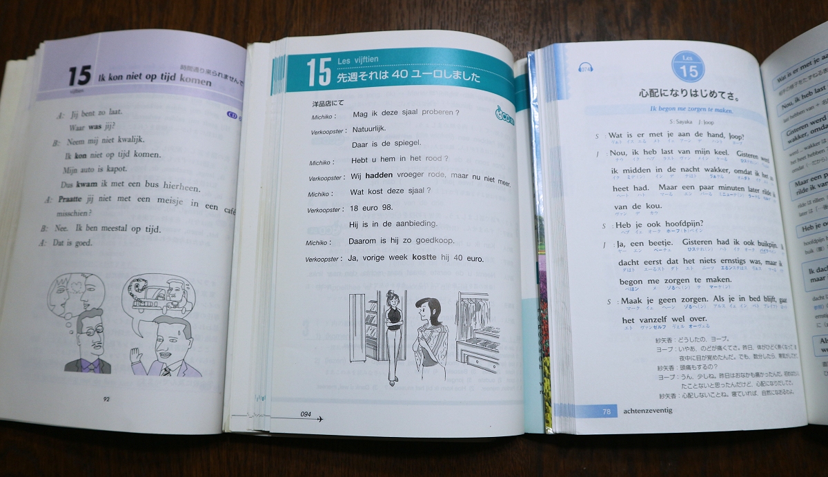 スタンダードな表現か、ナチュラルな表現を好むかは人それぞれ好みが分かれるところだと思いますが、Duolingoから移行するなら最初の二冊のほうがスムーズ。ただ二番目のニューエクスプレス「プラス」は重く、本を開きづらいので、頻繁に持ち歩いてしょっちゅう開くなら、旧版のニューエクスプレス オランダ語のほうが軽くて柔らかくて扱いがラクです。「プラス」がついていない分、巻末のコンテンツが若干少な目ではありますが、ページ数の増加を加味しても「プラス」は重い(どの言語もそう)。