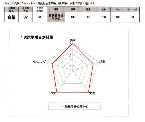 2010年7月、インドネシア語技能検定試験C級を受け、合格しました。 得点は、100点満点中92点でした。