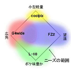 先日FZ2を購入したのは、そう考えたからでした。 Panasonic DMC-FZ2 は特長のはっきりした機で、望遠に強く、そのわりに大きさはとてもコンパクト。 まさに「ニーズの隅をきれいに掃く」のにぴったりの一台です。 反対側の隅は、これまた広角・接写に特化したコンパクト機、 RicohのCaplio G4wide あたりでいずれ掃くとして、 まずは守備範囲の広そうなFZ2を購入したのです。 これに手持ちのCoolpix2100と銀塩のL-10を加えると、 これでけっこうニーズが満たされてしまう。 実際の守備範囲は下の図のような感じでしょうか。