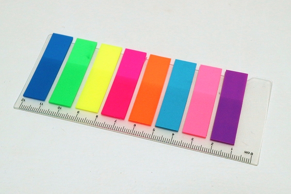 色が薄いところも気に入りました。以前はフィルム付箋紙といえばたいてい蛍光色で、黄色はいいのですが、青などは地色が濃すぎ、書き入れた文字が見えづらいのが難点でした。