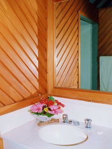 マナアイランドリゾートの木立の中には、"ブレ"と呼ばれるコテージが点在しています。 赤い花、黄色い葉の脇を通り抜けるとほら、これがわたしたちのブレ。 とっても簡素だけれど、気持ちのよい風が吹き抜ける楽しい我が家です。