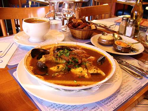 南仏の名物料理・ブイヤベース。 白い器に入ったスープは、「スプ・ド・ポワソン」(魚のスープ)です。