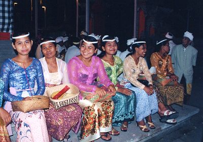 夕刻、老いも若きも女性はみな頭の上にお供え物を高々と積み上げ、寺院へ。