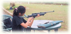 ところが。皆でエアガンシューティングに繰り出し、昨日アーチェリーの世話を見てくれたスタッフに声をかけ、 まずきりんが柄の長い鉄砲を構えると、