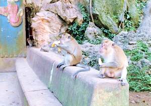 寺院の入り口近くにはなぜかお猿がたくさん! 生類を憐れむ仏陀の教えを励行するためか? エサも売っていました。